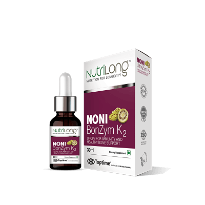 Highlights: Supports bone formation Supports in flexibility of arteries Immunity booster and reduces inflammation Composition: Each 1 ml of Noni BonZym k2 drops contain approximately 800mg extract of Noni, Vit-K2 of 55 mcg, Piper longum liquid extract of 5 mg Dosage: Use 1 ml diluted in 100 ml water and drink it daily 1- 2 times after meals.